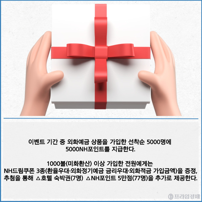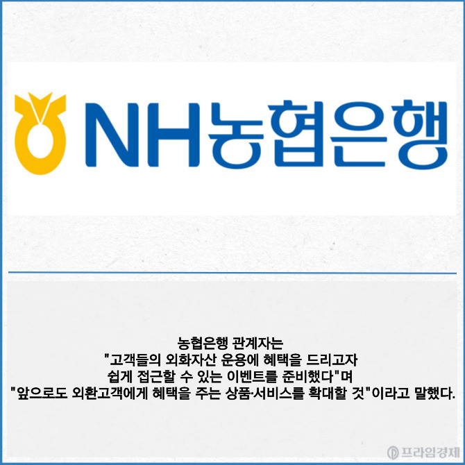 [프라임경제] NH농협은행이 내달 31일까지 외화예금 신규가입 고객을 대상으로 푸짐한 경품을 제공하는 '외화통장 DAY 1' 이벤트를 실시한다고 2일 밝혔다.