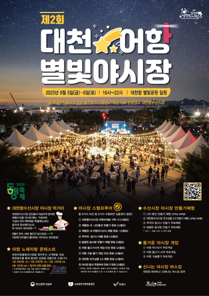 행사 현장에는 대천항수산시장 상인들이 직접 운영하는 먹거리 부스 5개소가 문을 열어 제철 수산물을 활용한 다채로운 메뉴를 선보인다. 또한, 관광객이 참여할 수 있는 스탬프투어(9개 미션 수행 시 온누리상품권 증정)와 어항 노래자랑 콘테스트도 마련돼 흥겨운 분위기를 더한다.