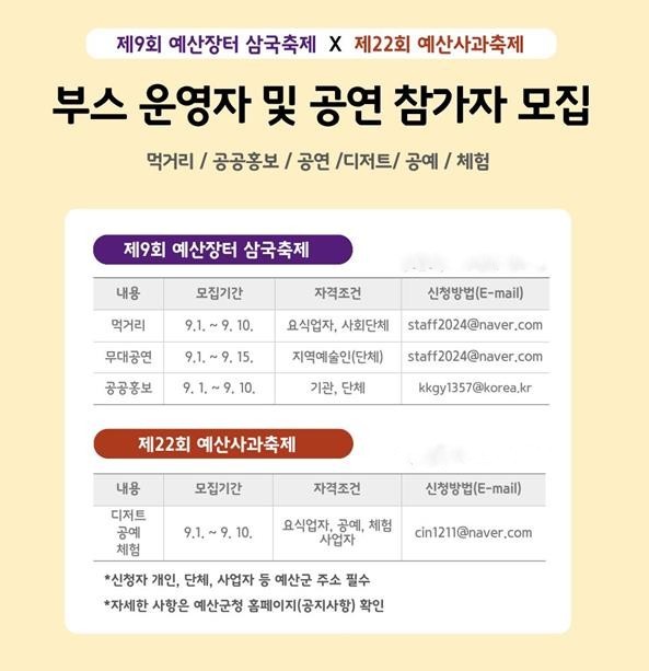 무대공연은 장르 구분 없이 20분 내외의 공연이 가능한 최근 1년 이상 활동 실적이 있는 관내 예술인 및 단체를 15개팀 내외로 모집하며, 사과축제 판매부스는 예산사과를 주제로 한 디저트·공예품·체험 프로그램을 운영할 관내 요식업자와 공예·체험 사업자 10개팀을 모집한다.