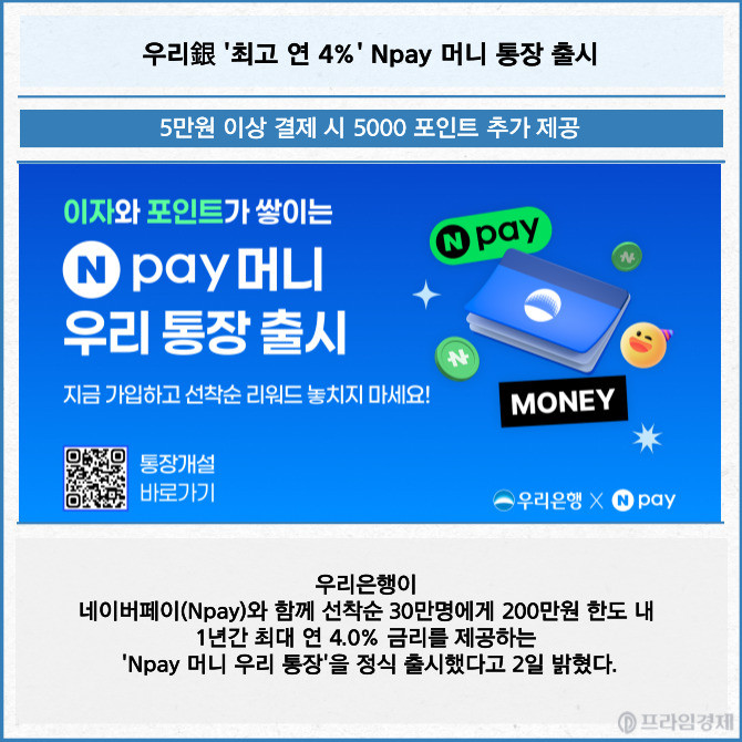 [카드] 우리銀 '최고 연 4%' Npay 머니 통장 출시
