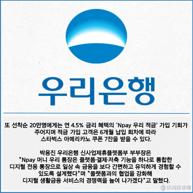 [프라임경제] 우리은행이 네이버페이(Npay)와 함께 선착순 30만명에게 200만원 한도 내 1년간 최대 연 4.0% 금리를 제공하는 'Npay 머니 우리 통장'을 정식 출시했다고 2일 밝혔다.