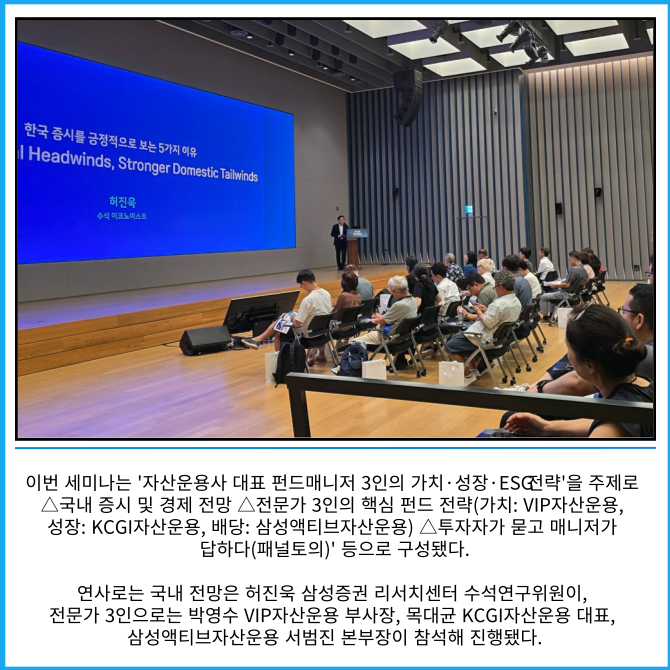 지난 8월 27일 열린 이번 세미나는 국내 증시 전망과 투자전략을 공유하기 위해 마련한 자리로, 국내 대표 운용사 3곳에서 참여한 가운데 약 200명의 디지털 우수고객이 참석해 높은 관심을 보였다.