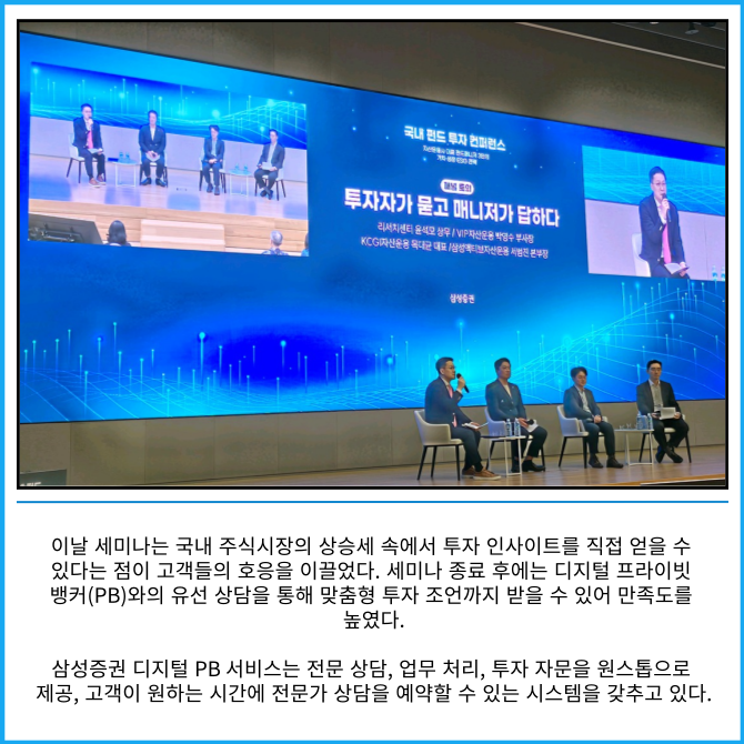 [프라임경제] 삼성증권(016360)은 디지털 우수고객을 대상으로 개최한 '국내 펀드 투자 컨퍼런스'가 성황리에 마무리했다고 2일 밝혔다.