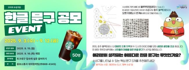 참여자들은 수성구를 대표할 수 있는 한글 문구 3개를 자유롭게 추천할 수 있으며, 추첨을 통해 50명에게 커피 모바일 교환권을 증정한다.