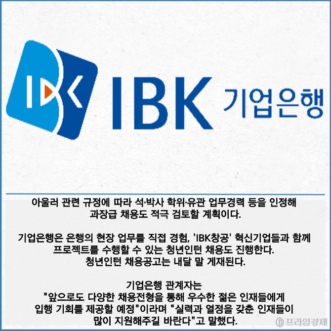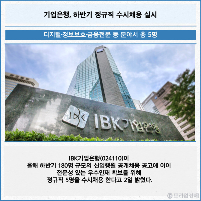 [프라임경제] IBK기업은행(024110)이 올해 하반기 180명 규모의 신입행원 공개채용 공고에 이어 전문성 있는 우수인재 확보를 위해 정규직 5명을 수시채용 한다고 2일 밝혔다.