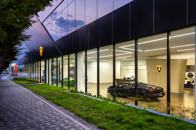 새로운 전시장은 람보르기니 특유의 디자인 언어를 반영해 깔끔한 라인, 날카로운 다각형 형태, 생동감 있는 컬러 포인트로 브랜드 본질을 구현했다.