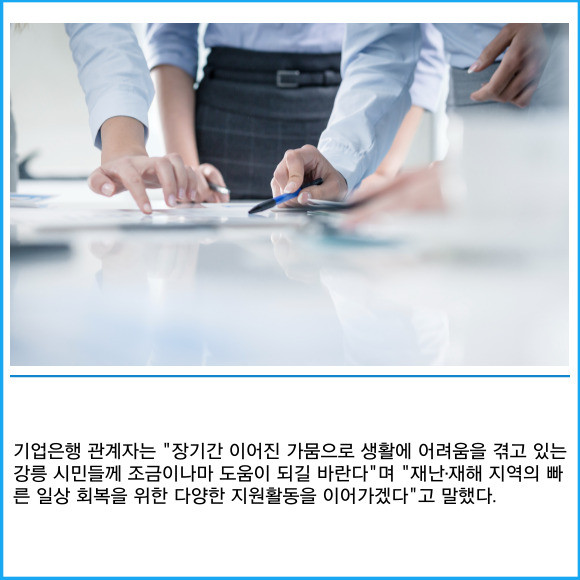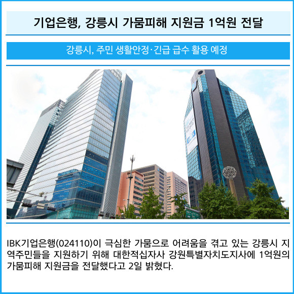 [프라임경제] IBK기업은행(024110)이 극심한 가뭄으로 어려움을 겪고 있는 강릉시 지역주민들을 지원하기 위해 대한적십자사 강원특별자치도지사에 1억원의 가뭄피해 지원금을 전달했다고 2일 밝혔다.