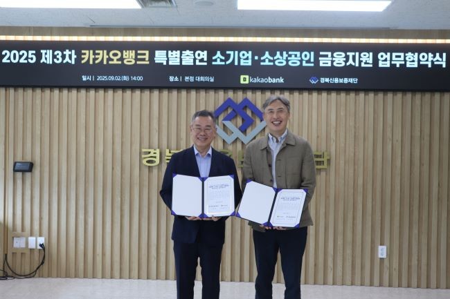 [프라임경제] 경북신용보증재단(이사장 김중권)은 2일 카카오뱅크와 '2025 카카오뱅크 특별출연 금융지원' 및 '2025 카카오뱅크 특별출연 외식업·전통시장 활성화 금융지원' 업무협약을 체결했다.