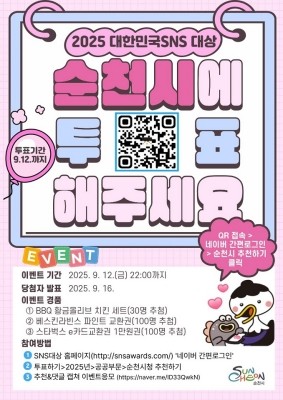 순천시(시장 노관규)는 '2025 대한민국 SNS 대상' 공공부문 수상을 목표로 오는 12일까지 전 국민을 대상으로 투표 이벤트를 진행한다.