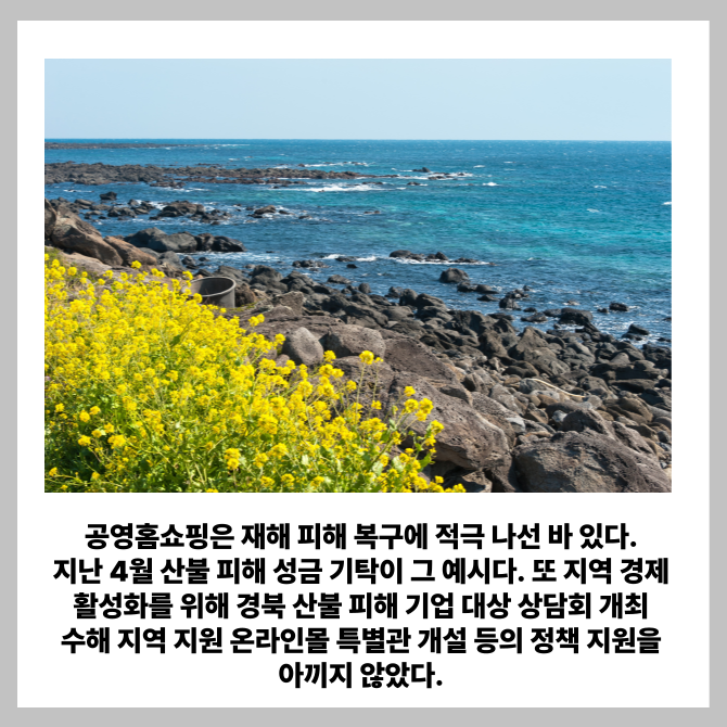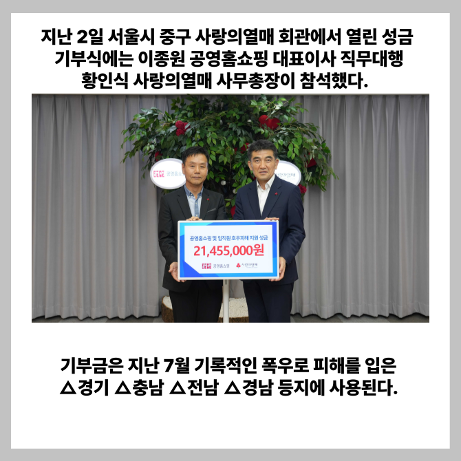 3일 공영홈쇼핑은 호우 피해 지역 복구·이재민의 일상 회복 지원을 위해 2145만원을 사회복지공동모금회에 기부했다고 밝혔다.