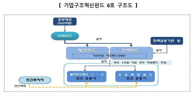 특히 원활한 민간투자 유치를 위해 정부 재정과 정책금융기관(산업은행·수출입은행·기업은행·한국자산관리공사) 출자금으로 조성한 모펀드 재원 5000억원 중 1000억원을 후순위 재원으로 설정했다. 후순위 재원 1000억원은 정부 재정 500억원, 한국자산관리공사 500억원으로 구성됐다.
