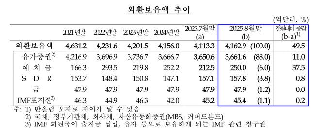 한국은행(이하 한은)이 3일 발표한 '8월 말 외환보유액'에 따르면 지난달 말 기준 외환보유액은 4162억9000만달러로 전월 말(4113억3000만달러) 대비 49억5000만달러 증가했다.