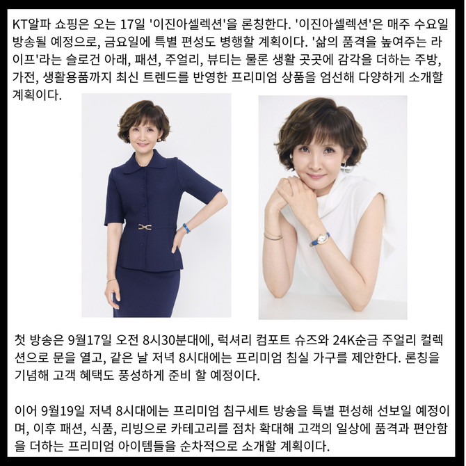 [프라임경제] KT알파 쇼핑이 홈쇼핑 업계 최고의 정상급 쇼호스트 이진아 씨를 전격 영입하고, 오는 9월17일부터 '이진아셀렉션'을 선보인다.