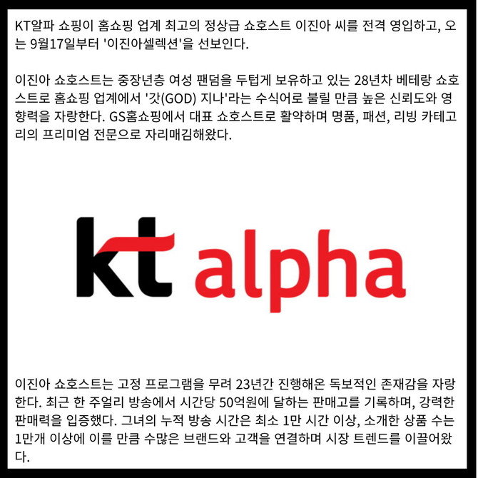 [카드] KT알파 쇼핑 '갓지나' 이진아 쇼호스트 영입... 9월17일 첫 론칭