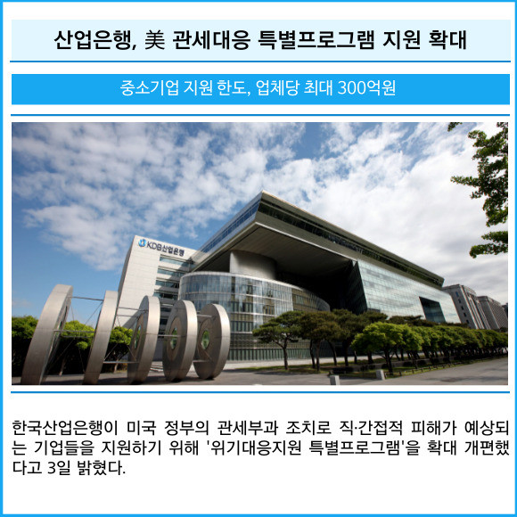 [프라임경제] 한국산업은행이 미국 정부의 관세부과 조치로 직·간접적 피해가 예상되는 기업들을 지원하기 위해 '위기대응지원 특별프로그램'을 확대 개편했다고 3일 밝혔다.