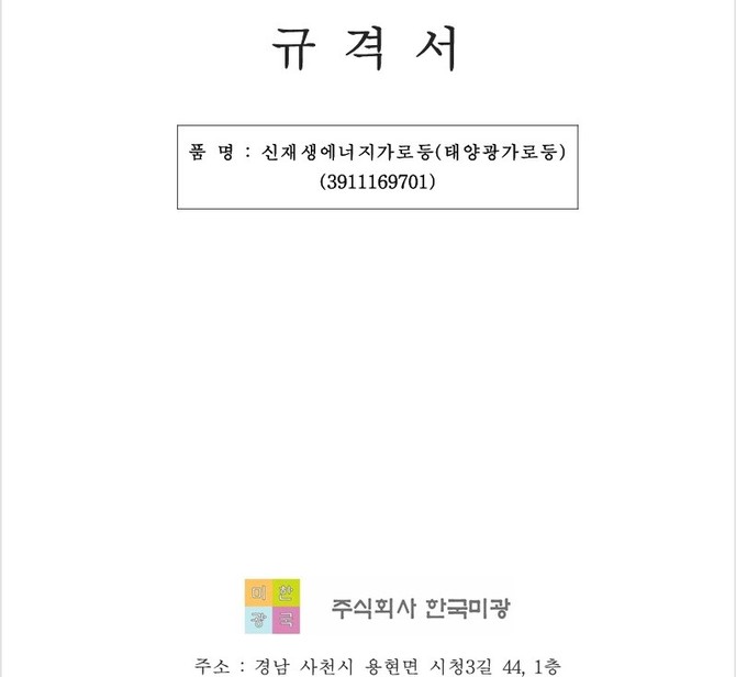 한국미광이 진주시와 지난 2024년 추진한 내동면 2호선 자전거도로 보안등 설치공사 금액은 태양광가로등 1752만원, 가로등기구 180만원이다.