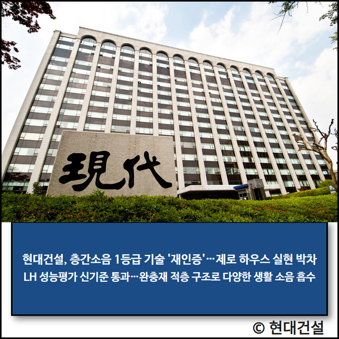 현대건설(000720)이 '층간소음 제로' 달성에 박차를 가하고 있는 가운데 최근 한국토지주택공사(LH)로부터 바닥충격음 차단구조 성능 1등급 인정서를 추가로 획득했다. 기존 기준보다 강화된 신평가에서도 2건의 1등급 인증을 받아 주거 품질 리더십을 입증했다.