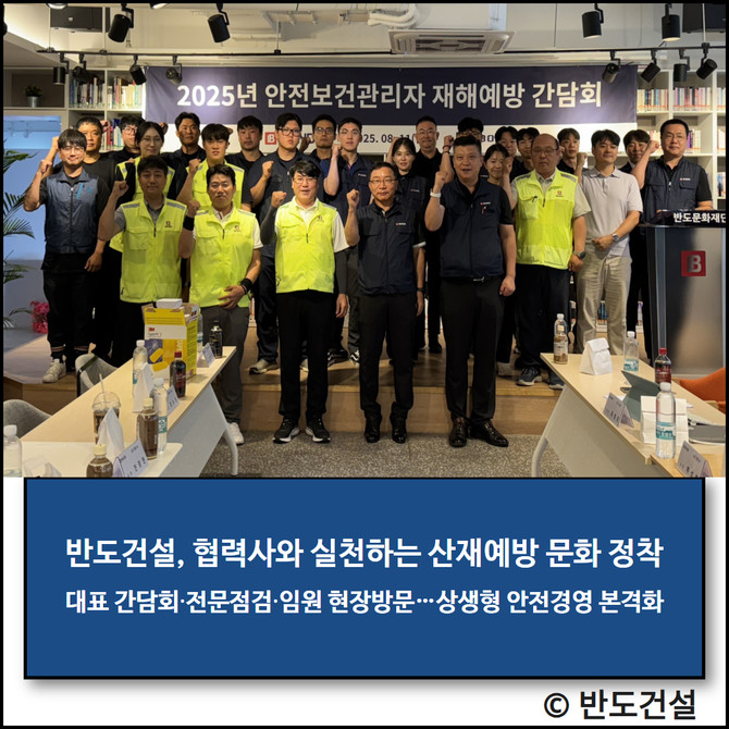 해당 컨설팅은 올해 4월부터 7월까지 시행됐다. 이는 협력사 실태 파악부터 현장 체계 점검, 개선안 제시 등 실행력을 높이기 위한 프로그램으로 구성됐다. 또한 반도건설은 고양 장항 카이브 유보라 현장에서 14개 협력사 대표이사가 참석한 가운데 대표 간담회를 열고, 산재 예방과 안전한 시공 환경 구축을 위한 의견을 공유했다.