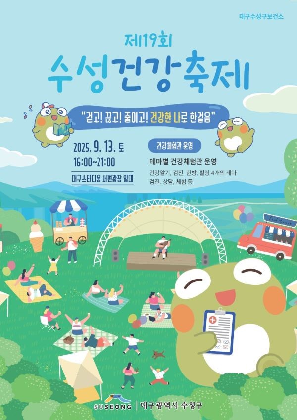 [프라임경제] 대구 수성구(구청장 김대권)에서 주최하는 '제19회 수성건강축제'가 오는 13일 오후 4시부터 9시까지 대구스타디움 서편광장 일대에서 개최된다.
