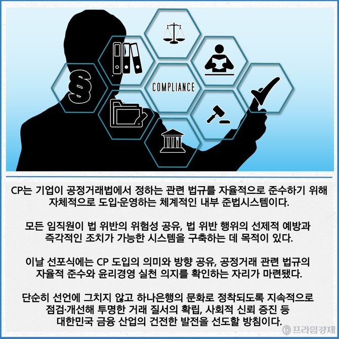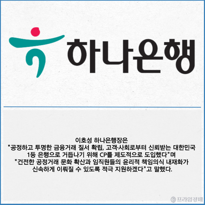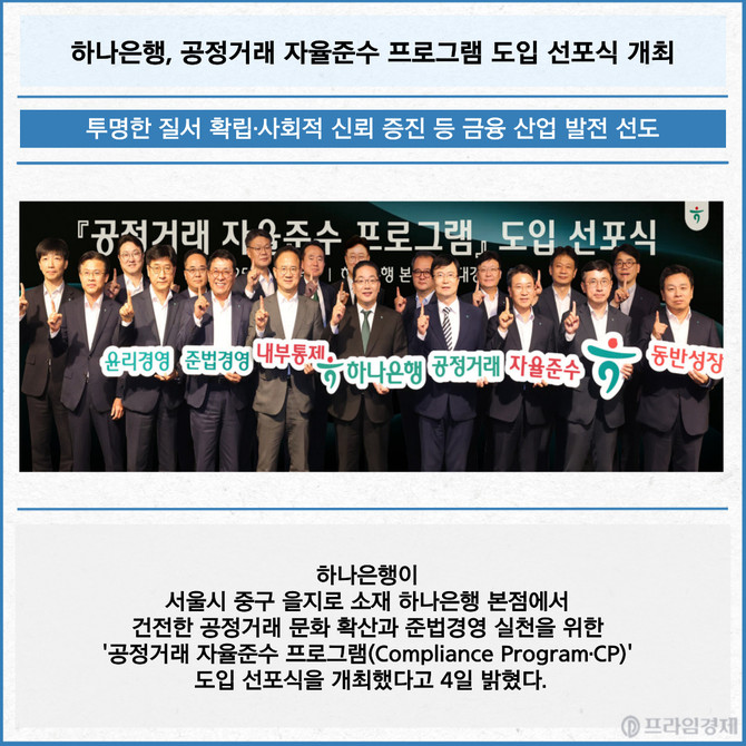 [프라임경제] 하나은행이 서울시 중구 을지로 소재 하나은행 본점에서 건전한 공정거래 문화 확산과 준법경영 실천을 위한 '공정거래 자율준수 프로그램(Compliance Program·CP)' 도입 선포식을 개최했다고 4일 밝혔다.