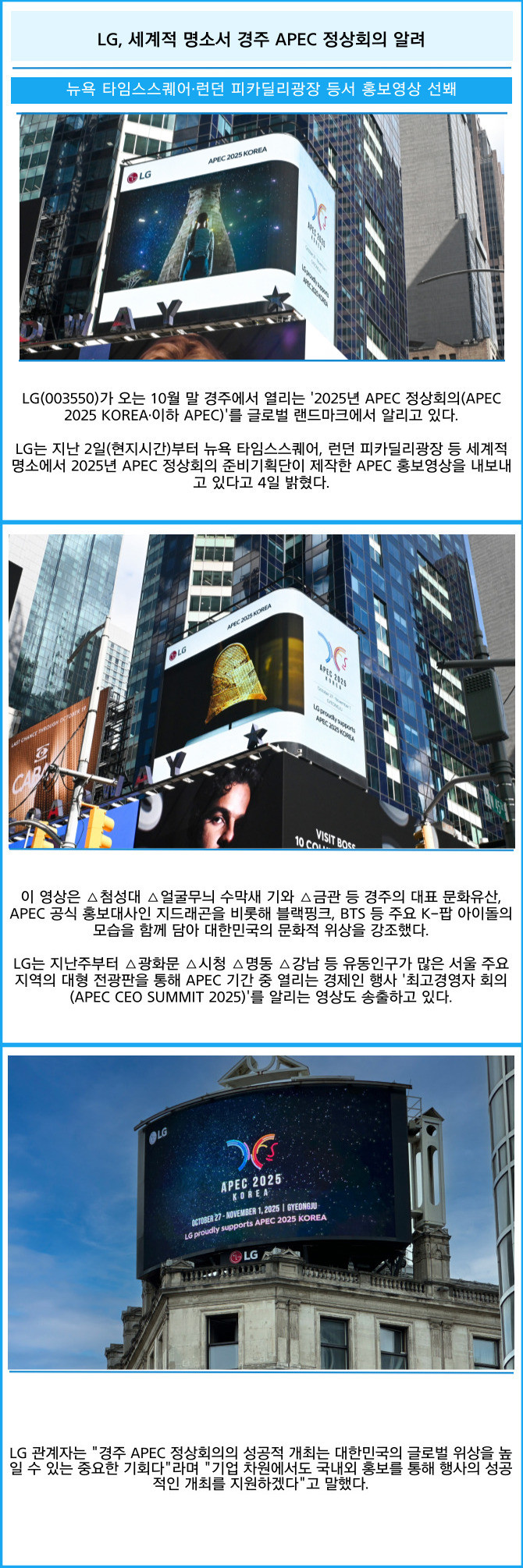 LG는 지난 2일(현지시간)부터 뉴욕 타임스스퀘어, 런던 피카딜리광장 등 세계적 명소에서 2025년 APEC 정상회의 준비기획단이 제작한 APEC 홍보영상을 내보내고 있다고 4일 밝혔다.