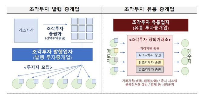 조각투자는 부동산·음원저작권 등 기초자산을 유동화해 다수의 투자자에게 분할 판매하는 구조다. 그간 각 플랫폼 안에서만 거래가 이뤄졌지만, 제도권 유통플랫폼이 신설되면 발행된 증권이 상장돼 다수 매수·매도자 간 거래가 가능해진다.
