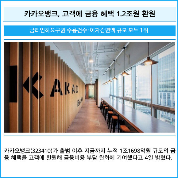 [프라임경제] 카카오뱅크(323410)가 출범 이후 지금까지 누적 1조1698억원 규모의 금융 혜택을 고객에 환원해 금융비용 부담 완화에 기여했다고 4일 밝혔다.