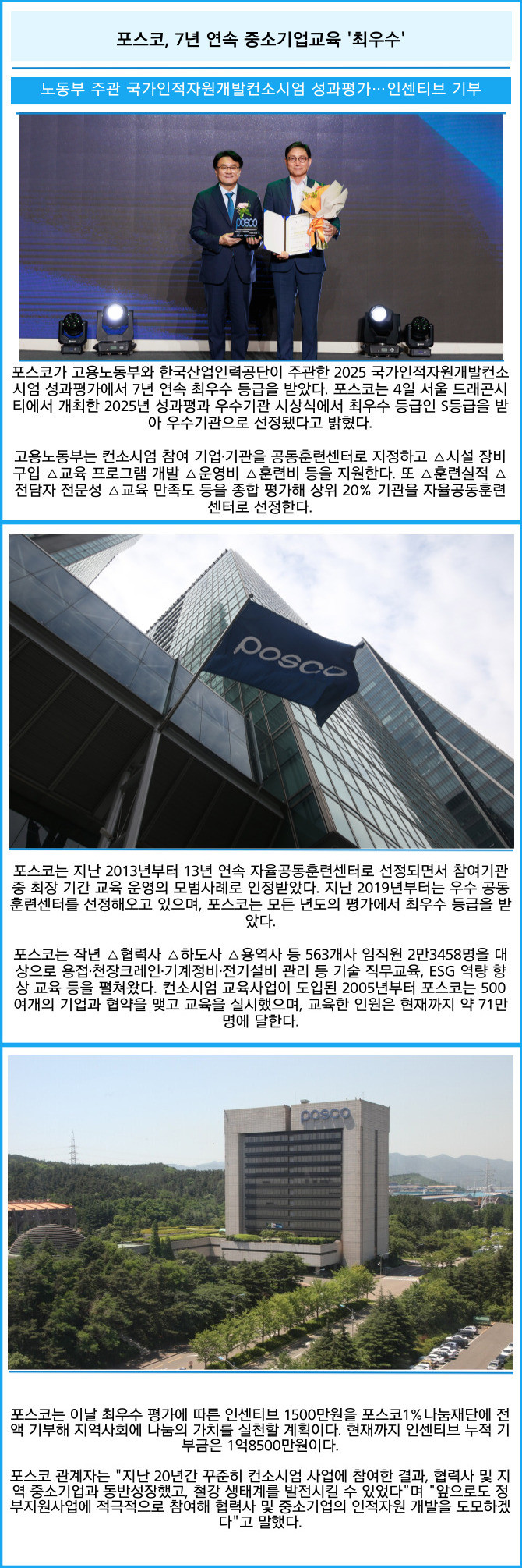 [프라임경제] 포스코가 고용노동부와 한국산업인력공단이 주관한 2025 국가인적자원개발컨소시엄 성과평가에서 7년 연속 최우수 등급을 받았다. 포스코는 4일 서울 드래곤시티에서 개최한 2025년 성과평과 우수기관 시상식에서 최우수 등급인 S등급을 받아 우수기관으로 선정됐다고 밝혔다.