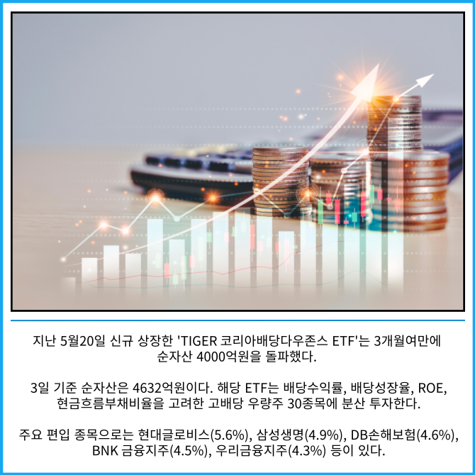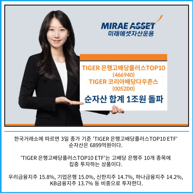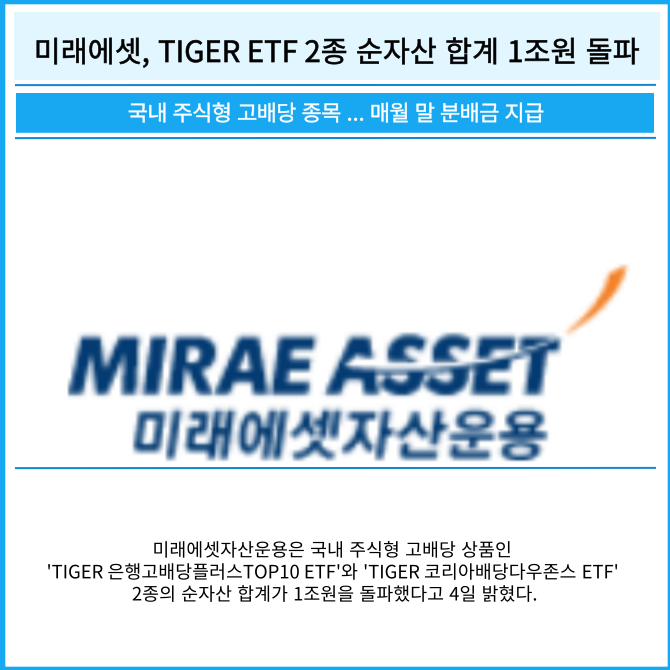[프라임경제] 미래에셋자산운용은 국내 주식형 고배당 상품인 'TIGER 은행고배당플러스TOP10 ETF'와 'TIGER 코리아배당다우존스 ETF' 2종의 순자산 합계가 1조원을 돌파했다고 4일 밝혔다.
