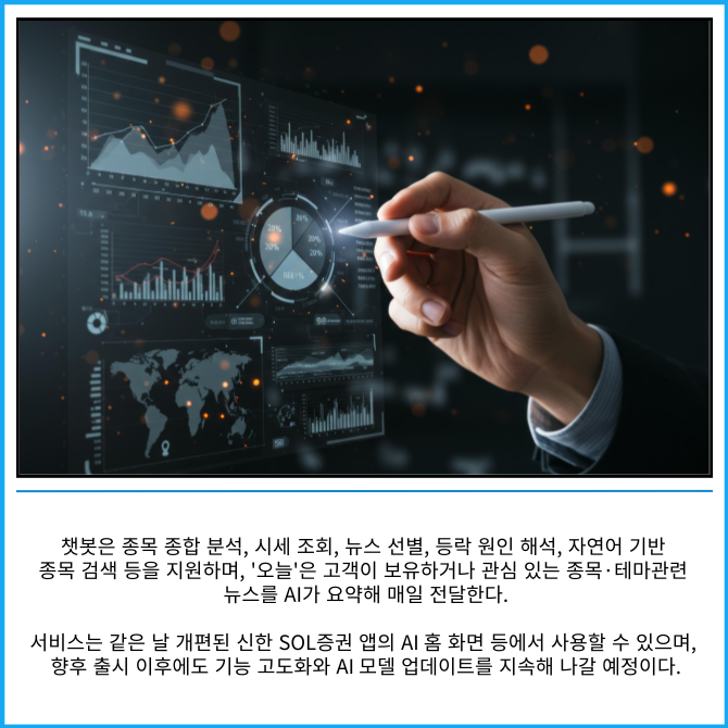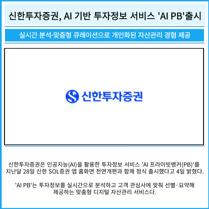 [프라임경제] 신한투자증권은 인공지능(AI)을 활용한 투자정보 서비스 'AI 프라이빗뱅커(PB)'를 지난달 28일 신한 SOL증권 앱 홈화면 전면개편과 함께 정식 출시했다고 4일 밝혔다.
