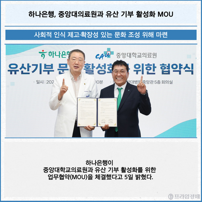 [프라임경제] 하나은행이 중앙대학교의료원과 유산 기부 활성화를 위한 업무협약(MOU)을 체결했다고 5일 밝혔다.