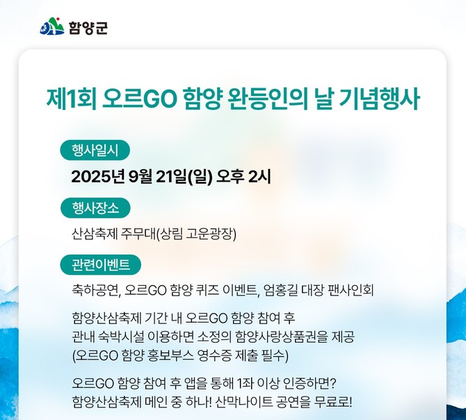[프라임경제] 함양군이 9월21일 오후 2시 상림공원 고운광장에서 '제1회 오르GO 함양 완등인의 날' 기념행사를 개최한다.