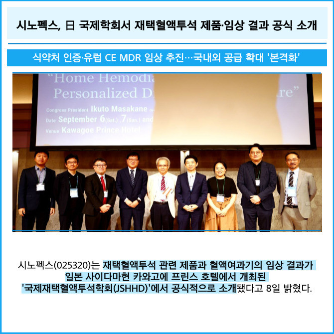 [프라임경제] 시노펙스(025320)는 재택혈액투석 관련 제품과 혈액여과기의 임상 결과가 일본 사이다마현 카와고에 프린스 호텔에서 개최된 '국제재택혈액투석학회(JSHHD)'에서 공식적으로 소개됐다고 8일 밝혔다.