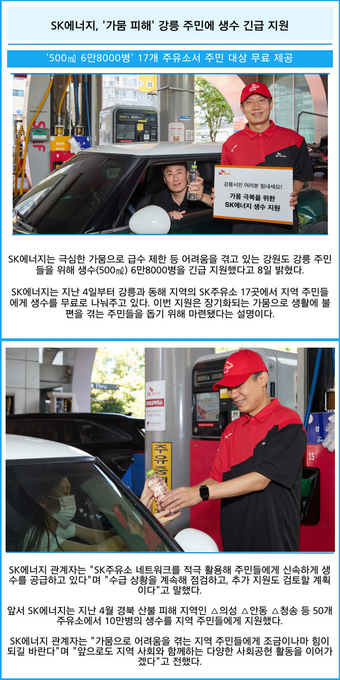 [프라임경제] SK에너지는 극심한 가뭄으로 급수 제한 등 어려움을 겪고 있는 강원도 강릉 주민들을 위해 생수(500㎖) 6만8000병을 긴급 지원했다고 8일 밝혔다.