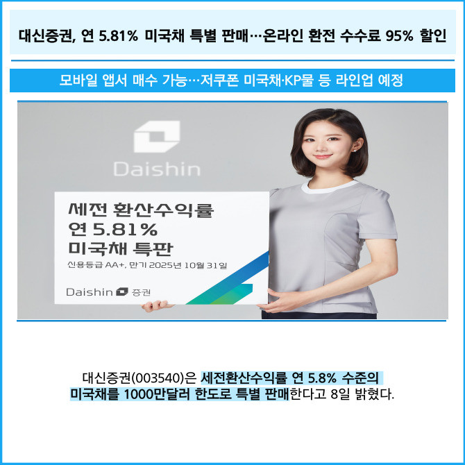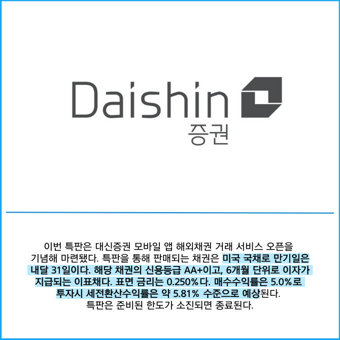 [프라임경제] 대신증권(003540)은 세전환산수익률 연 5.8% 수준의 미국채를 1000만달러 한도로 특별 판매한다고 8일 밝혔다.