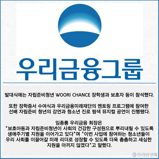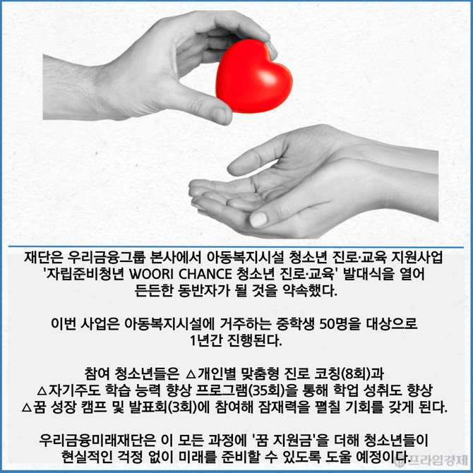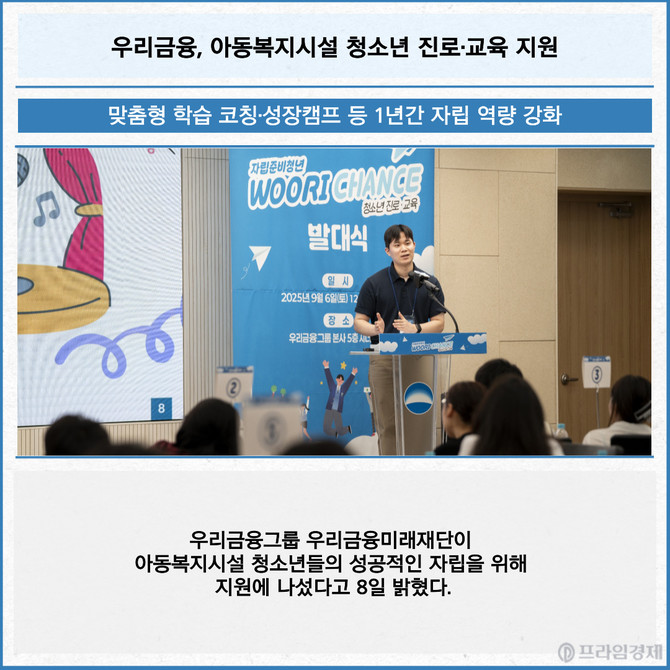 [프라임경제] 우리금융그룹 우리금융미래재단이 아동복지시설 청소년들의 성공적인 자립을 위해 지원에 나섰다고 8일 밝혔다.