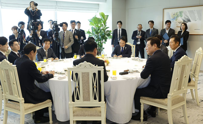 이 대통령은 이날 용산 대통령실 '여야 대표 오찬'에서 "여야가 국민들이 보기에 너무 과하게 부딪히고, 국민을 위한 정치를 하는지 아니면 특정한 이익을 위해 하는지를 이제 걱정하는 그런 상황이 되는 것은 정말 바람직하지 않다"며 이같이 말했다.
