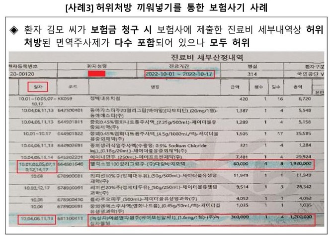 C병원은 환자의 진료기록에 실제로 투여하지 않은 주사 처방을 끼워 넣어 진료비를 부풀렸다. 환자는 실제 진료비만 수납했지만, 보험사 청구용 서류에는 허위 항목이 추가된 것이다. 조사 결과, 해당 병원 실장은 담당 의사의 신원을 도용해 면역주사제 등 허위 처방을 기록했으며, 이를 통해 편취한 보험금만 2839만원에 달했다.