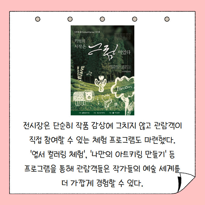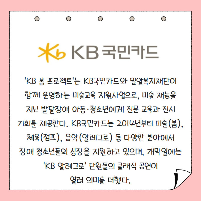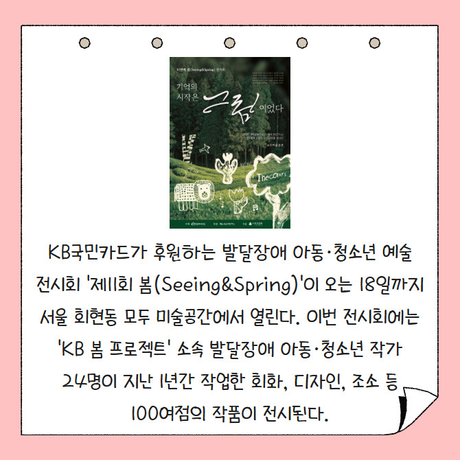 [프라임경제] KB국민카드가 후원하는 발달장애 아동·청소년 예술 전시회 '제11회 봄(Seeing&Spring)'이 오는 18일까지 서울 회현동 모두 미술공간에서 열린다. 이번 전시회에는 'KB 봄 프로젝트' 소속 발달장애 아동·청소년 작가 24명이 지난 1년간 작업한 회화, 디자인, 조소 등 100여점의 작품이 전시된다.
