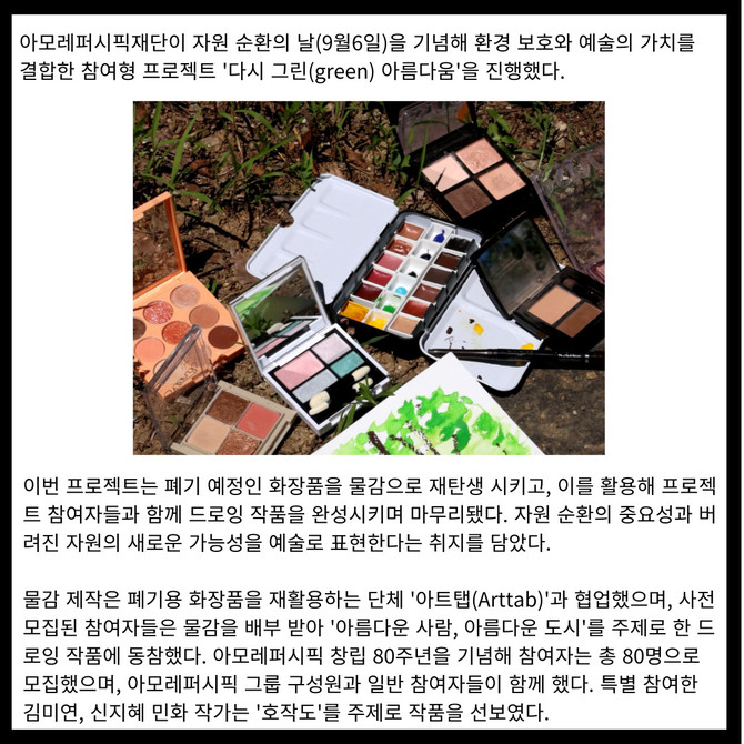 [프라임경제] 아모레퍼시픽재단이 자원 순환의 날(9월6일)을 기념해 환경 보호와 예술의 가치를 결합한 참여형 프로젝트 '다시 그린(green) 아름다움'을 진행했다.