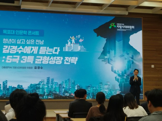 [프라임경제] 김경수 대통령직속 지방시대위원회 위원장은 9일 목포대학교 70주년 기념관에서 '청년이 살고 싶은 전남, 김경수에게 듣는다: 5극 3특 균형성장 전략'을 주제로 인문학 콘서트를 개최했다.