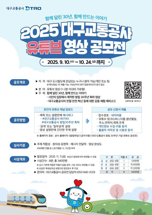 김기혁 사장은 "유튜브 영상 공모전을 통해 지난 30년간 공사와 동행해 주신 시민 여러분께 감사의 마음을 전하고자 한다"며 "대구도시철도와 영상 제작에 관심 있는 시민 여러분의 많은 참여를 바란다"고 말했다.