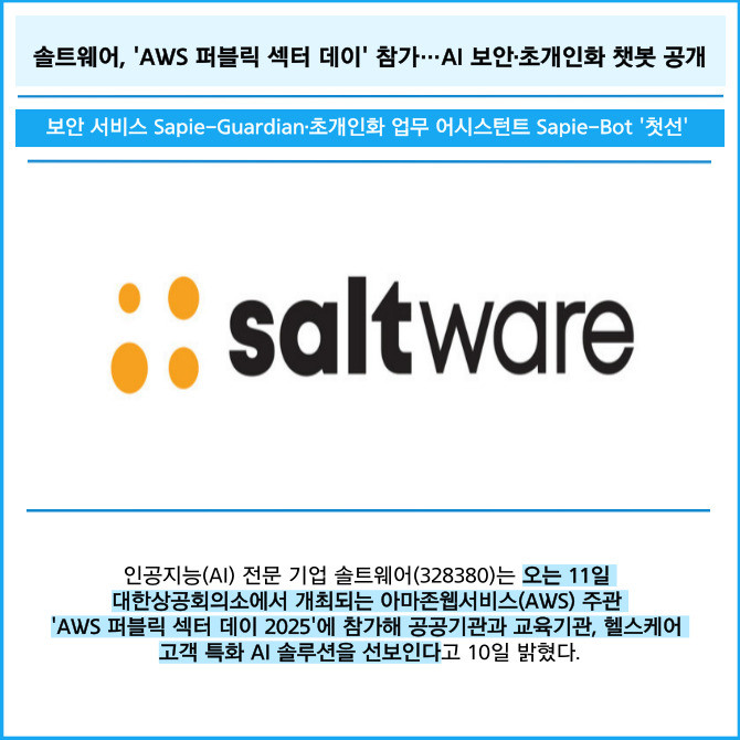 [프라임경제] 인공지능(AI) 전문 기업 솔트웨어(328380)는 오는 11일 대한상공회의소에서 개최되는 아마존웹서비스(AWS) 주관 'AWS 퍼블릭 섹터 데이 2025'에 참가해 공공기관과 교육기관, 헬스케어 고객 특화 AI 솔루션을 선보인다고 10일 밝혔다.