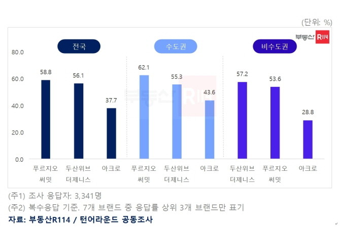 부동산R114와 턴어라운드가 지난달 11일부터 20일까지 전국 3341명 대상으로 진행한 '아파트 브랜드 경쟁력 진단 조사'에 따르면, 수도권에서는 푸르지오써밋이 62.1%로 가장 높은 인지도를 기록했다. 고급화된 상품성과 브랜드 충성도가 결합된 결과라는 평가다.
