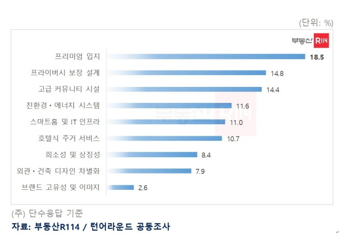 이번 조사에서는 '하이엔드 브랜드'로 인정받기 위한 조건으로 프리미엄 입지(18.5%)가 가장 많은 응답을 얻었다. 이어 △프라이버시 보장 설계(14.8%) △고급 커뮤니티 시설(14.4%) △친환경·에너지 시스템(11.6%) △스마트홈·IT 인프라(11.0%) 순이다.