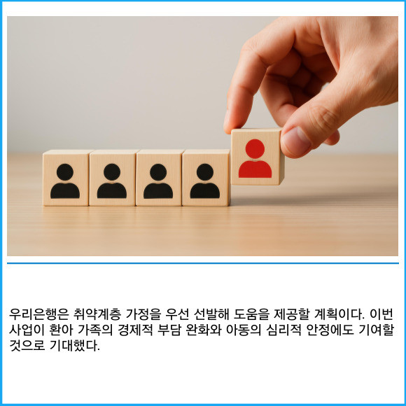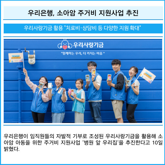 [프라임경제] 우리은행이 임직원들의 자발적 기부로 조성된 우리사랑기금을 활용해 소아암 아동을 위한 주거비 지원사업 '병원 앞 우리집'을 추진한다고 10일 밝혔다