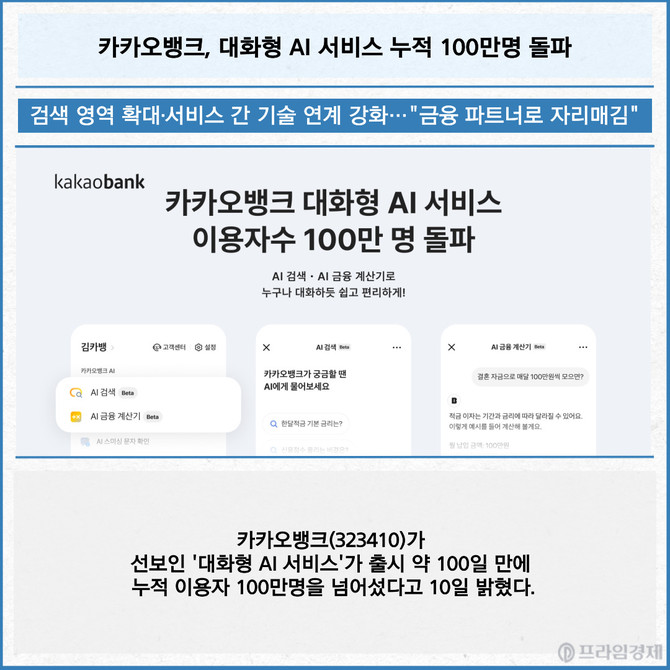 [프라임경제] 카카오뱅크(323410)가 선보인 '대화형 AI 서비스'가 출시 약 100일 만에 누적 이용자 100만명을 넘어섰다고 10일 밝혔다.