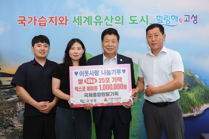 고성군(군수 이상근)은 국제종합렌탈기획 이재원 대표이사가 지난 9월7일 진행된 자녀의 결혼식에서 하객들로부터 화환 대신 받은 쌀 10kg 25포를 기부와 함께 2025년 고성공룡세계엑스포 예매권 100만원을 구입했다고 10일 밝혔다.