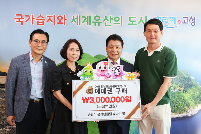 고성문화관광재단(대표이사 임왕건)은 손빈아 공식팬클럽 '빛나는 별'이 '2025 경남고성공룡세계엑스포'의 성공적인 개최를 위해, 지난 9월4일 고성군을 방문해 고성군청 예매권 300만 원어치를 구매했다고 9일 밝혔다.