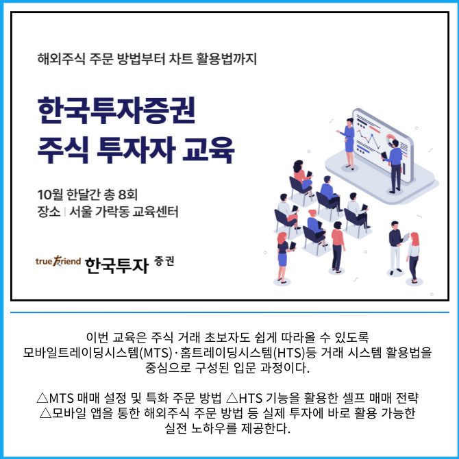 이번 교육은 주식 거래 초보자도 쉽게 따라올 수 있도록 모바일트레이딩시스템(MTS)·홈트레이딩시스템(HTS) 등 거래 시스템 활용법을 중심으로 구성된 입문 과정이다.